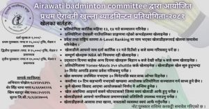 ऐरावती गाउँपालिकाको कवड हलमा २ दिनसम्म सञ्चालन हुने प्रतियोगितामा नेपाल ब्याडमिन्टन संघको नियम अनुसार खेल खेलाइने आयोजक ऐरावती ब्याडमिन्टन समुहले जानकारी दिएकोे छ ।